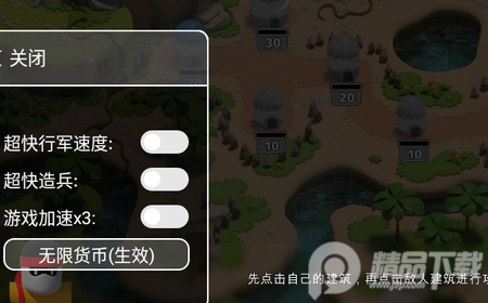 3、左侧技能可提升士兵能力,如士兵赶路速度、士兵攻击力、建筑防御力等。