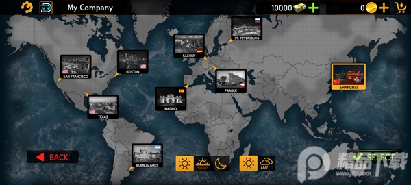 3、选择你想要去的地区,游戏内有各种现实的城内和城外地图:美国(旧金山和德克萨斯)、南美洲(布宜诺斯艾利斯)、欧洲(德国、西班牙、布拉格、圣彼得堡)、迪拜、上海等等,还可以在下方选择当前地区一天中的多个时间和天气条件,点击SELECT即可。