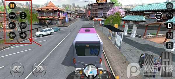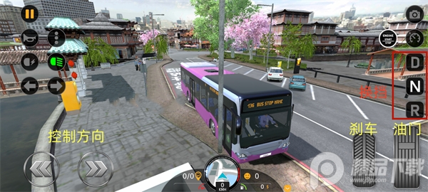 7、进入游戏后就可以操作,小编在图中为各位小伙伴进行了简单标注,其中D为前进挡,也称驱动挡;N为空挡,暂时停车时(如红灯),注意,此挡位表示空挡,为防止车辆在斜坡上溜动,一定要踩着刹车。R为倒车挡,倒车时用。