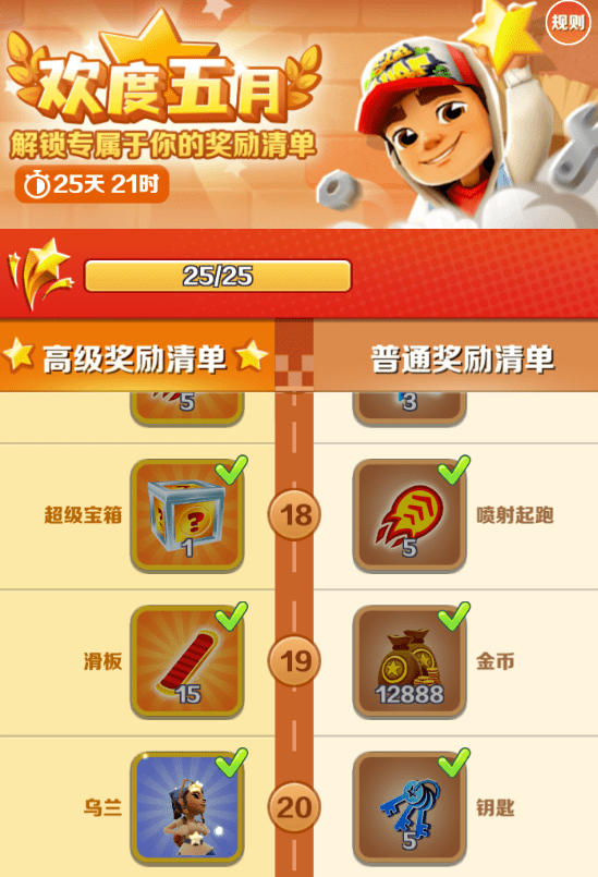 1.限时活动-欢度五月:通过无尽模式赛道或指定任务收集「星星」,解锁高级奖励清单即可获得「乌兰」角色&「枫叶」滑板