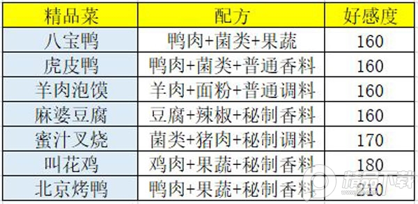 当然凡事也有例外,其一是我们的蜜汁叉烧,增加170好感度,但是消耗元宝为90。它比同样消耗90元宝的叫花鸡少了10点好感度。其二则是我们的北京烤鸭,为增加210好感度,消耗110元宝。它按着正常算法应该是增加220好感度的。