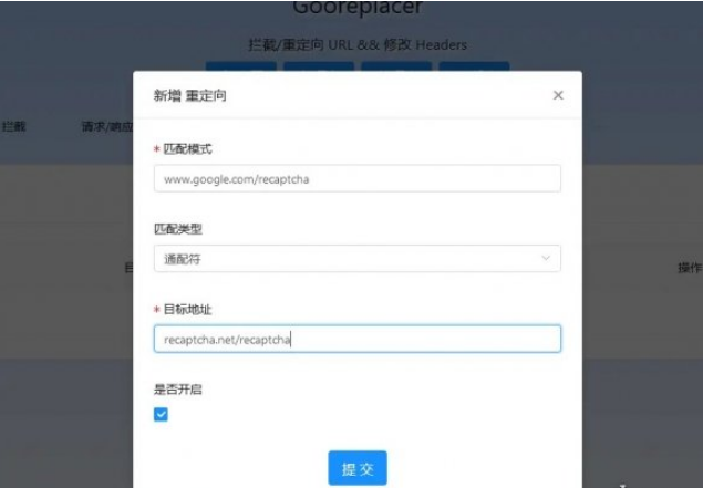 匹配模式:(https://www.google.com/recaptcha)目标地址:(https://recaptcha.net/recaptcha)。