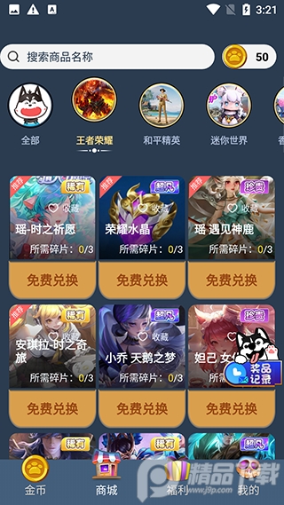 2、可以看到大部分热门游戏的皮肤都有,每种皮肤都是需要三块对应的碎片才能兑换的。