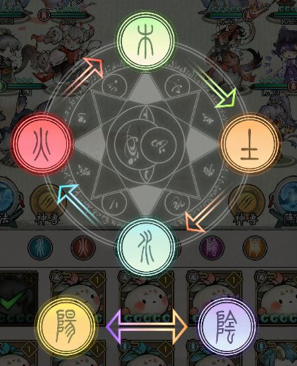 除了阵营克制外,不知道细心的道友有没有发现,我们在对战局中还加入了阵法设定,即在当前出战的圣灵阵容中,六系属性会组成不同的阵法给队伍带来属性加成。