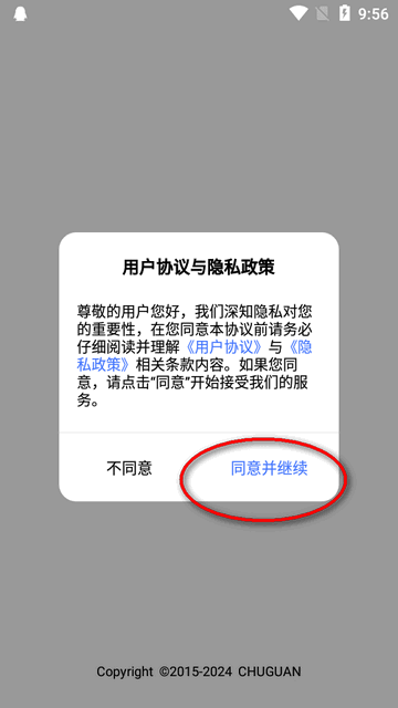 2、初次进入软件需要同意并继续用户协议与隐私政策。