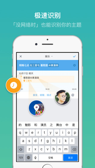 【极速识别】在日历添加页面一口气输入主题,实时识别主题中的时间、地点和参与人信息,并且支持离线操作!