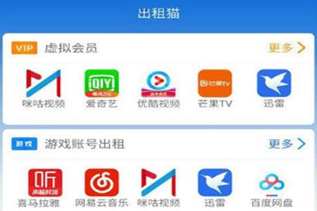出租猫APP为用户提供了国内各大视频网站、音乐平台、小说平台的VIP账号租用服务,包含了咪咕视频、爱奇艺、优酷视频、芒果TV、迅雷、网易云音乐等等,还有其他类型的账号,小说、视频、音乐、网盘下载等VIP账号都可以在这里轻松的租用;如果您有闲置的视频、音乐、小说等VIP账号,也可以直接发布到平台进行租赁,让帮您可以着这里长期获得更多的租金;为了让用户可以获得更好的账号租用体验,对账号进行了详细的分类,满足许多用户租用VIP账号的需求,需要的用户快来下载使用吧!