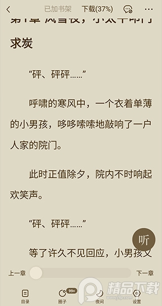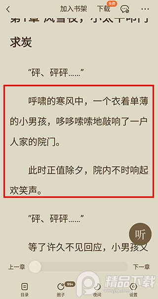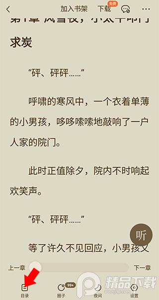 1、我们选择想要听书的小说后,来到小说阅读界面,点击小说正中间区域(差不多下方红框位置)即可弹出菜单
