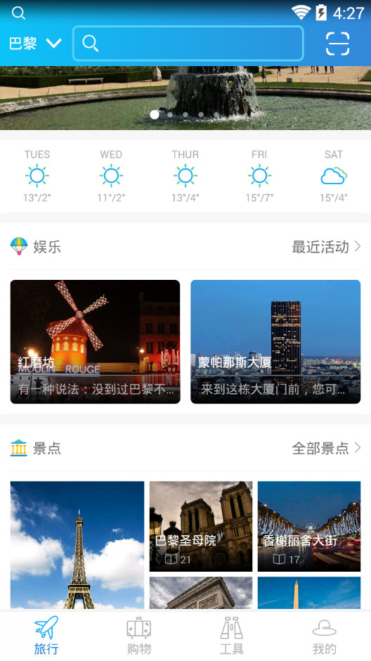 游客可通过app获取出境旅游目的地实时天气信息,景点、美食、娱乐等游玩攻略。