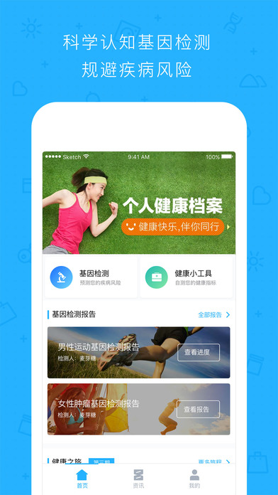 随着年龄的上升,大病离我们越来越近,我们要从生活彻底抵御,目前以基因检测这一项目为起点,针对性预知预测疾病的风险,为用户定制个性化的健康管理方案,做到未病先知、未病先“治”;并通过健康之旅及健康直播两个特色栏目,丰富用户的健康体验。