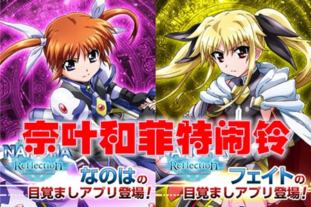 剧场版《魔法少女奈叶Reflection》分别推出了《魔法少女奈叶Reflection奈叶闹铃》和《魔法少女奈叶Reflection菲特闹铃》,这两款APP中分别收录了高町奈叶(CV:田村由加莉)、菲特·泰斯特罗莎·哈拉温(CV:水树奈奈)的70种闹铃语音,用户可以根据个人喜好,最多用3种语音一起组合使用。触摸首页插画就可以听到角色语音,可以更换闹铃启动时的画面。此外,这两款APP还有重复闹铃以及闹铃再响功能,另外还有30款追加语音,追加语音售价360日元(约合人民币21元),粉丝不容错过。