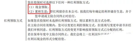 第二种:累积生息,前5年的红利不领取,放在保险公司存着,同时也给予一定的利息作为回报,到合同结束的时候,连同期满金或者身故金+红利+利息一起给客户。