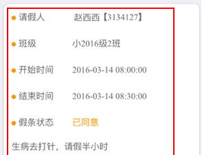 7.请假条:发送(家长)、审核(老师)请假条,并与考勤数据对接