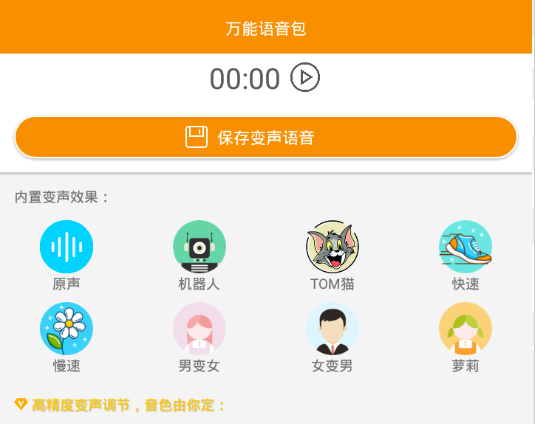万能语音包是一款可以将您的声音改变成多种非常有趣的效果的应用,可以将变声后的语音通过微信、QQ、探探等聊天工具发送给好友,