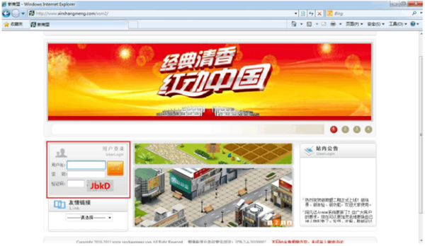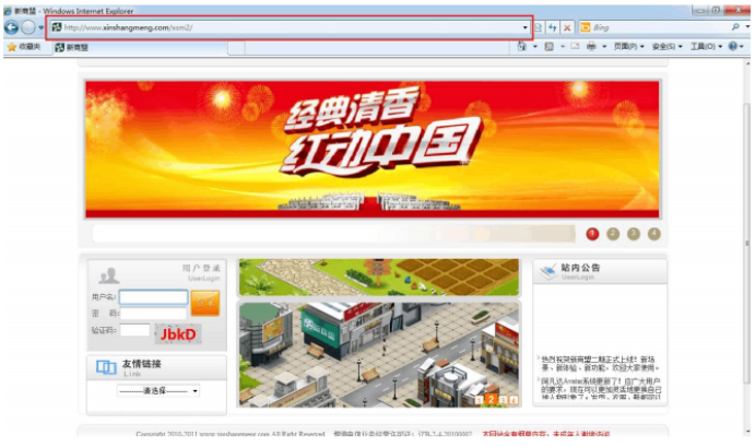 登录第一步:打开浏览器(遨游\Firefox\ Mozilla等),在地址栏(图中红色框处)输入新商盟网址( www.xinshangmeng.com),如图: