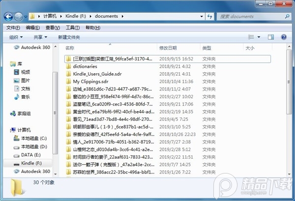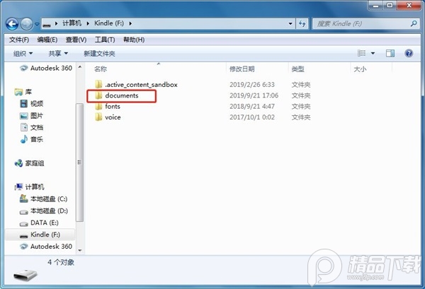 ② 下面是以“Kindle(F:)”命名的文件夹,打开这个文件夹,找“documents”,即文件的意思。▼