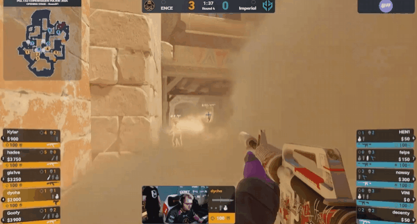 第四回合noway抓住时机从水房烟雾边缘拉出,击杀两人帮助队伍赢下回合,下一回合ENCE人数优势没能爆弹打进B包。比分打平3-3,ENCE二换二打进A点放下c4,Imperial两人走A大的回防被交叉架住,HEN1选择保狙。